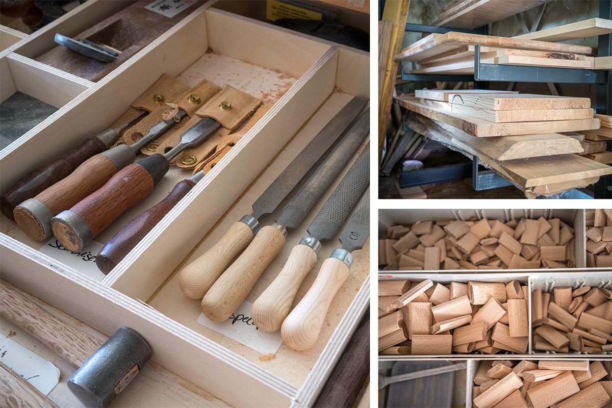 Willkommen in meiner kleinen Werkstatt! Schleifen, Fräsen, Sägen und das Verbindungssystem mit Festool; Bohren und die Stichsäge von Bosch Professional; Radio von  Makita. Dazu ausgesuchte Handwerkzeuge, v.a. japanische Zugsägen, Hobel, Stemmeisen und unzählige Schraubzwingen.